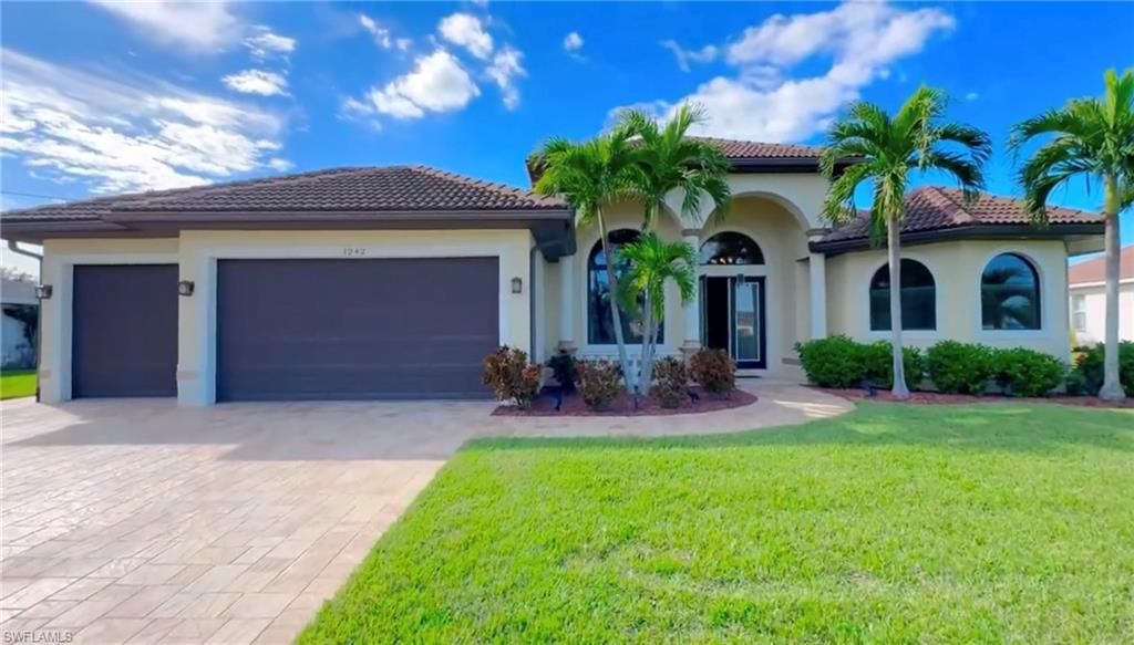 An exquisite and one of the kind lake front luxurious property, that was built on triple size lot. This fabulous single story and open floor plan home offers 3 bedrooms + den/office (that could be converted into 4th bedroom if needed, since it has a window and a closet), plus 3 bathrooms, a very spacious and fully enclosed / screened in outdoor lanai area, that has a salt water heated pool and jacuzzi, as well as, plenty room outside for dinning and entertaining. With a western exposure in the back of the house, property offers priceless sunsets and stunning lake views. Fantastic home for recreational boat lovers, kayak enthusiasts, fishermen and other outdoors activities that are offered by this beautiful lake in the back of the house. Custom built home has 3 car garages with high ceilings. Property is located in NO FLOOD zone, therefore flood insurance is not required !!! No rental restrictions and No HOA fees. This is a paradise gem for someone who is looking to make this property their vacation or secondary home, rental income opportunity property or even a primary residency.